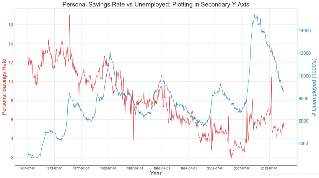 # Import Datadf = pd.read_csv("https://github.com/selva86/datasets/raw/master/economics.csv")x = df['date']y1 = df['psavert']y2 = df['unemploy']# Plot Line1 (Left Y Axis)fig, ax1 = plt.subplots(1,1,figsize=(16,9), dpi= 80)ax1.plot(x, y1, color='tab:red')# Plot Line2 (Right Y Axis)ax2 = ax1.twinx() # instantiate a second axes that shares the same x-axisax2.plot(x, y2, color='tab:blue')# Decorations# ax1 (left Y axis)ax1.set_xlabel('Year', fontsize=20)ax1.tick_params(axis='x', rotation=0, labelsize=12)ax1.set_ylabel('Personal Savings Rate', color='tab:red', fontsize=20)ax1.tick_params(axis='y', rotation=0, labelcolor='tab:red' )ax1.grid(alpha=.4)# ax2 (right Y axis)ax2.set_ylabel("# Unemployed (1000's)", color='tab:blue', fontsize=20)ax2.tick_params(axis='y', labelcolor='tab:blue')ax2.set_xticks(np.arange(0, len(x), 60))ax2.set_xticklabels(x[::60], rotation=90, fontdict={'fontsize':10})ax2.set_title("Personal Savings Rate vs Unemployed: Plotting in Secondary Y Axis", fontsize=22)fig.tight_layout()plt.show()