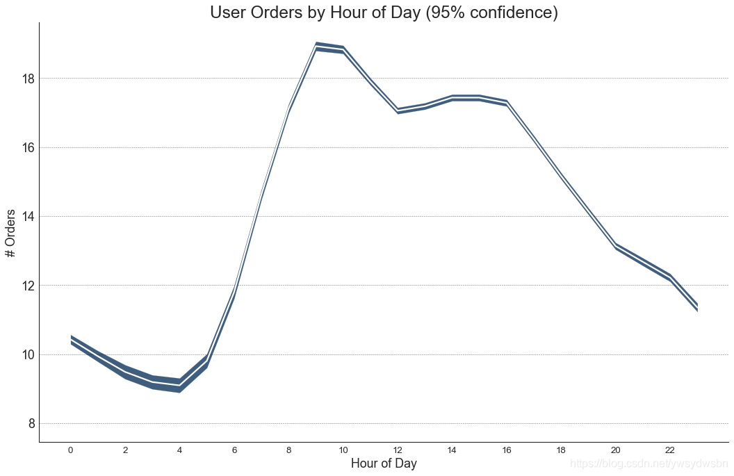 from scipy.stats import sem# Import Datadf = pd.read_csv("https://raw.githubusercontent.com/selva86/datasets/master/user_orders_hourofday.csv")df_mean = df.groupby('order_hour_of_day').quantity.mean()df_se = df.groupby('order_hour_of_day').quantity.apply(sem).mul(1.96)# Plotplt.figure(figsize=(16,10), dpi= 80)plt.ylabel("# Orders", fontsize=16)x = df_mean.indexplt.plot(x, df_mean, color="white", lw=2)plt.fill_between(x, df_mean - df_se, df_mean + df_se, color="#3F5D7D")# Decorations# Lighten bordersplt.gca().spines["top"].set_alpha(0)plt.gca().spines["bottom"].set_alpha(1)plt.gca().spines["right"].set_alpha(0)plt.gca().spines["left"].set_alpha(1)plt.xticks(x[::2], [str(d) for d in x[::2]] , fontsize=12)plt.title("User Orders by Hour of Day (95% confidence)", fontsize=22)plt.xlabel("Hour of Day")s, e = plt.gca().get_xlim()plt.xlim(s, e)# Draw Horizontal Tick linesfor y in range(8, 20, 2):plt.hlines(y, xmin=s, xmax=e, colors='black', alpha=0.5, linestyles="--", lw=0.5)plt.show()