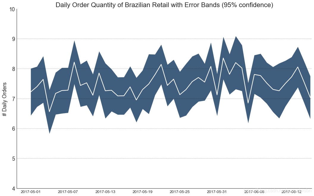 # "Data Source: https://www.kaggle.com/olistbr/brazilian-ecommerce#olist_orders_dataset.csv"from dateutil.parser import parsefrom scipy.stats import sem# Import Datadf_raw = pd.read_csv('https://raw.githubusercontent.com/selva86/datasets/master/orders_45d.csv',parse_dates=['purchase_time', 'purchase_date'])# Prepare Data: Daily Mean and SE Bandsdf_mean = df_raw.groupby('purchase_date').quantity.mean()df_se = df_raw.groupby('purchase_date').quantity.apply(sem).mul(1.96)# Plotplt.figure(figsize=(16,10), dpi= 80)plt.ylabel("# Daily Orders", fontsize=16)x = [d.date().strftime('%Y-%m-%d') for d in df_mean.index]plt.plot(x, df_mean, color="white", lw=2)plt.fill_between(x, df_mean - df_se, df_mean + df_se, color="#3F5D7D")# Decorations# Lighten bordersplt.gca().spines["top"].set_alpha(0)plt.gca().spines["bottom"].set_alpha(1)plt.gca().spines["right"].set_alpha(0)plt.gca().spines["left"].set_alpha(1)plt.xticks(x[::6], [str(d) for d in x[::6]] , fontsize=12)plt.title("Daily Order Quantity of Brazilian Retail with Error Bands (95% confidence)", fontsize=20)# Axis limitss, e = plt.gca().get_xlim()plt.xlim(s, e-2)plt.ylim(4, 10)# Draw Horizontal Tick linesfor y in range(5, 10, 1):plt.hlines(y, xmin=s, xmax=e, colors='black', alpha=0.5, linestyles="--", lw=0.5)plt.show()