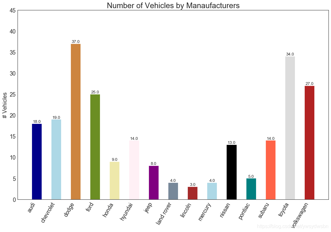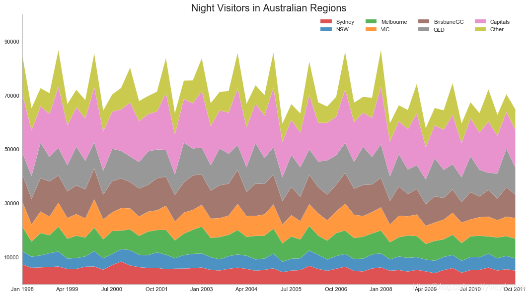 # Import Datadf = pd.read_csv('https://raw.githubusercontent.com/selva86/datasets/master/nightvisitors.csv')# Decide Colorsmycolors = ['tab:red', 'tab:blue', 'tab:green', 'tab:orange', 'tab:brown', 'tab:grey', 'tab:pink', 'tab:olive']# Draw Plot and Annotatefig, ax = plt.subplots(1,1,figsize=(16, 9), dpi= 80)columns = df.columns[1:]labs = columns.values.tolist()# Prepare datax = df['yearmon'].values.tolist()y0 = df[columns[0]].values.tolist()y1 = df[columns[1]].values.tolist()y2 = df[columns[2]].values.tolist()y3 = df[columns[3]].values.tolist()y4 = df[columns[4]].values.tolist()y5 = df[columns[5]].values.tolist()y6 = df[columns[6]].values.tolist()y7 = df[columns[7]].values.tolist()y = np.vstack([y0, y2, y4, y6, y7, y5, y1, y3])# Plot for each columnlabs = columns.values.tolist()ax = plt.gca()ax.stackplot(x, y, labels=labs, colors=mycolors, alpha=0.8)# Decorationsax.set_title('Night Visitors in Australian Regions', fontsize=18)ax.set(ylim=[0, 100000])ax.legend(fontsize=10, ncol=4)plt.xticks(x[::5], fontsize=10, horizontalalignment='center')plt.yticks(np.arange(10000, 100000, 20000), fontsize=10)plt.xlim(x[0], x[-1])# Lighten bordersplt.gca().spines["top"].set_alpha(0)plt.gca().spines["bottom"].set_alpha(.3)plt.gca().spines["right"].set_alpha(0)plt.gca().spines["left"].set_alpha(.3)plt.show()