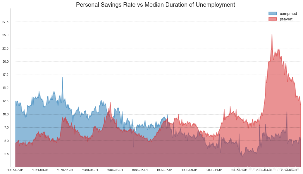 # Import Datadf = pd.read_csv("https://github.com/selva86/datasets/raw/master/economics.csv")# Prepare Datax = df['date'].values.tolist()y1 = df['psavert'].values.tolist()y2 = df['uempmed'].values.tolist()mycolors = ['tab:red', 'tab:blue', 'tab:green', 'tab:orange', 'tab:brown', 'tab:grey', 'tab:pink', 'tab:olive']columns = ['psavert', 'uempmed']# Draw Plotfig, ax = plt.subplots(1, 1, figsize=(16,9), dpi= 80)ax.fill_between(x, y1=y1, y2=0, label=columns[1], alpha=0.5, color=mycolors[1], linewidth=2)ax.fill_between(x, y1=y2, y2=0, label=columns[0], alpha=0.5, color=mycolors[0], linewidth=2)# Decorationsax.set_title('Personal Savings Rate vs Median Duration of Unemployment', fontsize=18)ax.set(ylim=[0, 30])ax.legend(loc='best', fontsize=12)plt.xticks(x[::50], fontsize=10, horizontalalignment='center')plt.yticks(np.arange(2.5, 30.0, 2.5), fontsize=10)plt.xlim(-10, x[-1])# Draw Tick linesfor y in np.arange(2.5, 30.0, 2.5):plt.hlines(y, xmin=0, xmax=len(x), colors='black', alpha=0.3, linestyles="--", lw=0.5)# Lighten bordersplt.gca().spines["top"].set_alpha(0)plt.gca().spines["bottom"].set_alpha(.3)plt.gca().spines["right"].set_alpha(0)plt.gca().spines["left"].set_alpha(.3)plt.show()