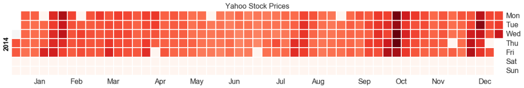# 导入资源库:pip install calmapimport matplotlib as mplimport calmap# Import Datadf = pd.read_csv("https://raw.githubusercontent.com/selva86/datasets/master/yahoo.csv", parse_dates=['date'])df.set_index('date', inplace=True)# Plotplt.figure(figsize=(16,10), dpi= 80)calmap.calendarplot(df['2014']['VIX.Close'], fig_kws={'figsize': (16,10)}, yearlabel_kws={'color':'black', 'fontsize':14}, subplot_kws={'title':'Yahoo Stock Prices'})plt.show()