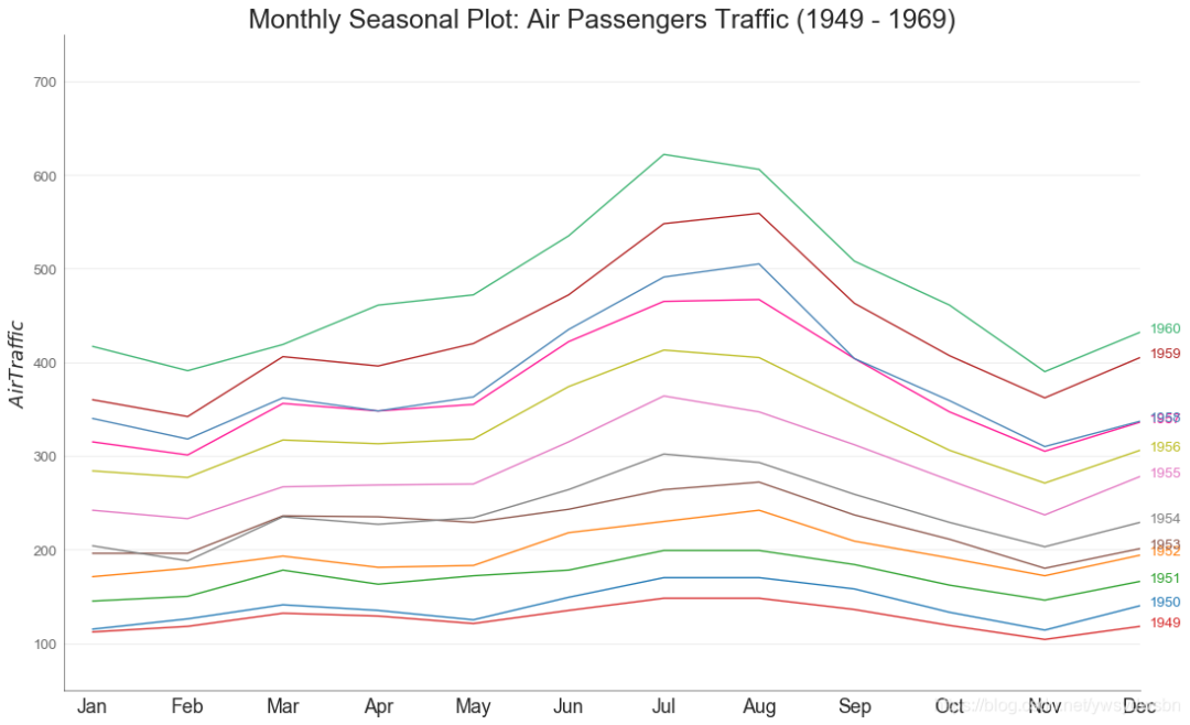 from dateutil.parser import parse# Import Datadf = pd.read_csv('https://github.com/selva86/datasets/raw/master/AirPassengers.csv')# Prepare datadf['year'] = [parse(d).year for d in df.date]df['month'] = [parse(d).strftime('%b') for d in df.date]years = df['year'].unique()# Draw Plotmycolors = ['tab:red', 'tab:blue', 'tab:green', 'tab:orange', 'tab:brown', 'tab:grey', 'tab:pink', 'tab:olive', 'deeppink', 'steelblue', 'firebrick', 'mediumseagreen']plt.figure(figsize=(16,10), dpi= 80)for i, y in enumerate(years):plt.plot('month', 'traffic', data=df.loc[df.year==y, :], color=mycolors[i], label=y)plt.text(df.loc[df.year==y, :].shape[0]-.9, df.loc[df.year==y, 'traffic'][-1:].values[0], y, fontsize=12, color=mycolors[i])# Decorationplt.ylim(50,750)plt.xlim(-0.3, 11)plt.ylabel('$Air Traffic$')plt.yticks(fontsize=12, alpha=.7)plt.title("Monthly Seasonal Plot: Air Passengers Traffic (1949 - 1969)", fontsize=22)plt.grid(axis='y', alpha=.3)# Remove bordersplt.gca().spines["top"].set_alpha(0.0)plt.gca().spines["bottom"].set_alpha(0.5)plt.gca().spines["right"].set_alpha(0.0)plt.gca().spines["left"].set_alpha(0.5)# plt.legend(loc='upper right', ncol=2, fontsize=12)plt.show()
