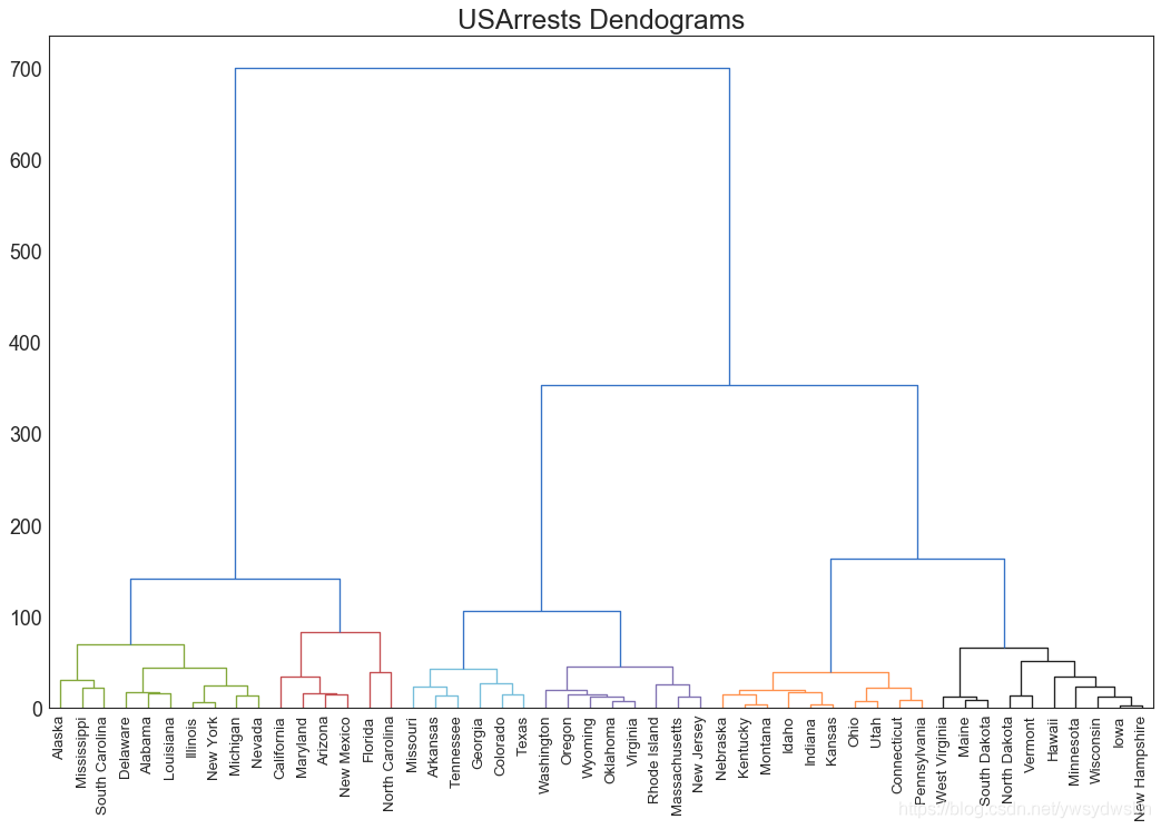 import scipy.cluster.hierarchy as shc# Import Datadf = pd.read_csv('https://raw.githubusercontent.com/selva86/datasets/master/USArrests.csv')# Plotplt.figure(figsize=(16, 10), dpi= 80)plt.title("USArrests Dendograms", fontsize=22)dend = shc.dendrogram(shc.linkage(df[['Murder', 'Assault', 'UrbanPop', 'Rape']], method='ward'), labels=df.State.values, color_threshold=100)plt.xticks(fontsize=12)plt.show()