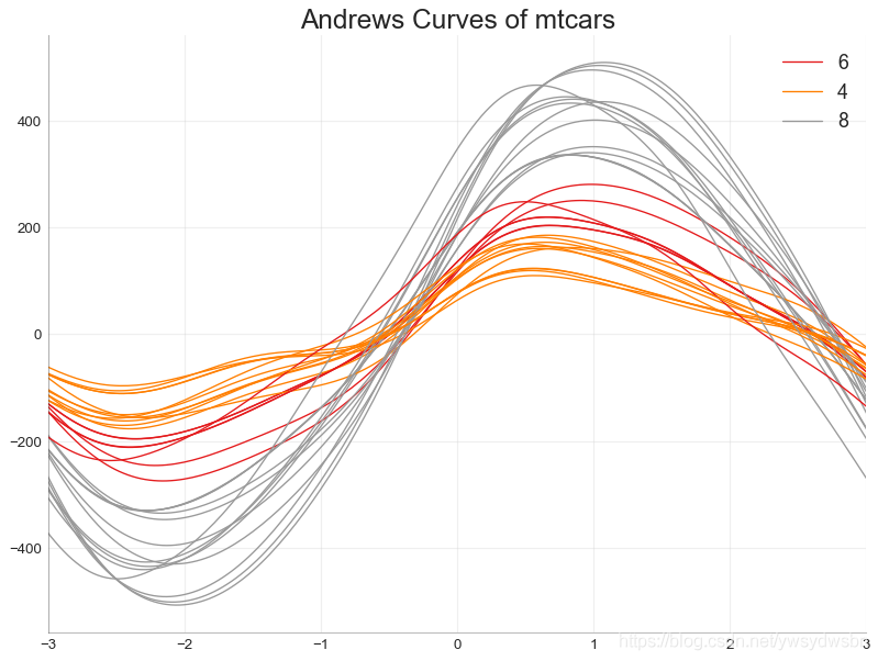 from pandas.plotting import andrews_curves# Importdf = pd.read_csv("https://github.com/selva86/datasets/raw/master/mtcars.csv")df.drop(['cars', 'carname'], axis=1, inplace=True)# Plotplt.figure(figsize=(12,9), dpi= 80)andrews_curves(df, 'cyl', colormap='Set1')# Lighten bordersplt.gca().spines["top"].set_alpha(0)plt.gca().spines["bottom"].set_alpha(.3)plt.gca().spines["right"].set_alpha(0)plt.gca().spines["left"].set_alpha(.3)plt.title('Andrews Curves of mtcars', fontsize=22)plt.xlim(-3,3)plt.grid(alpha=0.3)plt.xticks(fontsize=12)plt.yticks(fontsize=12)plt.show()