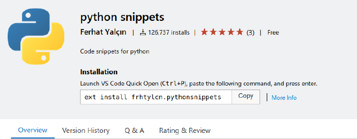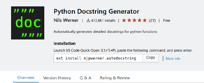 Python Snippets 是由 Ferhat Yalçın 开发的内置代码片段包的扩展。这个扩展对开发者非常友好,尤其是对 Python 初学者。它包含许多内置代码段,比如 string、list、sets、tuple、dictionary、class 等等。使用此插件的另一个优点:它还为每个代码段提供了至少一个示例,这对学习 Python 的人来说非常有帮助。Python Snippets 下载地址:https://marketplace.visualstudio.com/items?itemName=frhtylcn.pythonsnippetsPython Docstring Generator