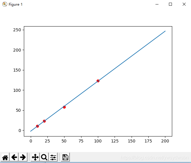 import numpy as npfrom scipy.optimize import leastsqimport matplotlib.pyplot as pltdef func(p, x):k, b = preturn k * x + bdef error(p, x, y):return func(p, x) - yX = np.array([10, 20, 50, 100])Y = np.array([11, 23, 58, 123])P = (0, 0)ret = leastsq(error, P, args=(X, Y))k, b = ret[0]print(k, b)plt.figure()plt.scatter(X, Y, color='red')x = np.linspace(0, 200, 200)y = k * x + bplt.plot(x, y)plt.show()