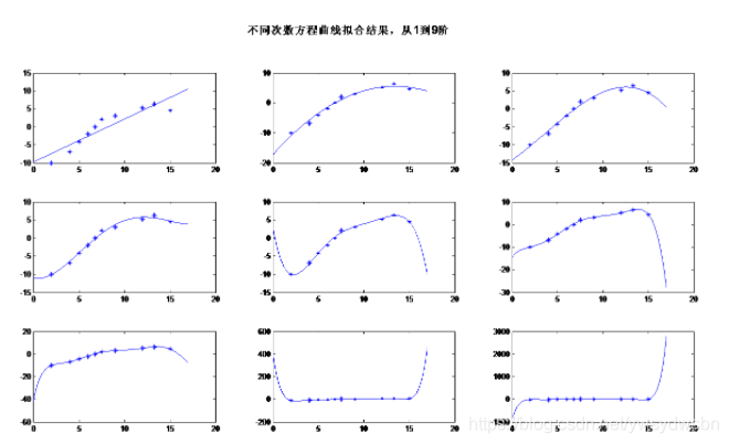 clearclcx=[2,4,5,6,6.8,7.5,9,12,13.3,15];[~,k]=size(x);y=[-10,-6.9,-4.2,-2,0,2.1,3,5.2,6.4,4.5];for n=1:9ANSS=polyfit(x,y,n); %用polyfit拟合曲线for i=1:n+1 %answer矩阵存储每次求得的方程系数,按列存储answer(i,n)=ANSS(i);endx0=0:0.01:17;y0=ANSS(1)*x0.^n ; %根据求得的系数初始化并构造多项式方程for num=2:1:n+1y0=y0+ANSS(num)*x0.^(n+1-num);endsubplot(3,3,n)plot(x,y,'*')hold onplot(x0,y0)endsuptitle('不同次数方程曲线拟合结果,从1到9阶')