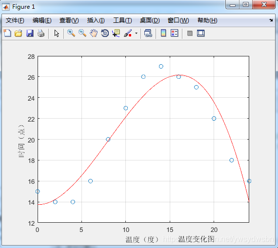 x = [0 2 4 6 8 10 12 14 16 18 20 22 24]y = [15 14 14 16 20 23 26 27 26 25 22 18 16]plot(x,y,'o')grid onhold on% 三阶拟合 得到的 p = -0.0061 0.1474 -0.0246 13.7390是个多项式的系数% 即拟合的曲线y = -0.0061*x3 + 0.1474*x2 - 0.0246*x + 13.7390 (其中x3表示x的3次方,x2同理)p = polyfit(x,y,3)x1 = 0:0.01:24y1 = polyval(p,x1)plot(x1,y1,'r')axis([0 24 12 28]) % axis坐标轴范围设置xlabel('温度(度)');ylabel('时间(点)');title('温度变化图','position', [18,10])