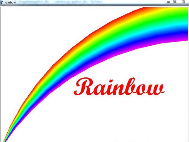 from turtle import *#控制彩虹路径def path(pen, r, g, b):pen.penup()pen.goto(-400, -300)pen.pendown()pen.pencolor(r, g, b)pen.circle(1000, -180)pen.pensize(2)pen.right(0.05)#绘制彩虹控制颜色def Rainbow():pen = Turtle()pen.right(110)r = 255g = 0b = 0interval = 5colormode(255)# 由红到黄while g < 256:path(pen, r, g, b)g = g + interval#由黄到绿g = 255while r > 0:r = r - intervalpath(pen, r, g, b)#由绿到青r = 0while (b < 255 ):b = b + intervalpath(pen, r, g, b)b = 255#由青到蓝while (g > 0):g = g - intervalpath(pen, r, g, b)#由蓝到紫到红g = 0while r < 255:r = r + intervalpath(pen, r, g, b)#文字输出def TextFun():text = Turtle()text.hideturtle()text.color("red")text.penup()text.setpos(100, -100)text.pendown()text.write("Rainbow", False, align="center", font=("Script MT Bold", 80, "bold"))def main():setup(800, 600, 0, 0)title("rainbow")tracer(False)Rainbow()TextFun()tracer(True)mainloop()if __name__ == '__main__':main()