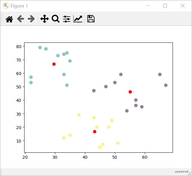 import pandas as pdimport matplotlib.pyplot as pltfrom sklearn.cluster import KMeansdf = pd.DataFrame({"x": [25, 34, 22, 27, 33, 33, 31, 22, 35, 34, 67, 54, 57, 43, 50, 57, 59, 52, 65, 47, 49, 48, 35, 33, 44, 45, 38, 43, 51, 46],"y": [79, 51, 53, 78, 59, 74, 73, 57, 69, 75, 51, 32, 40, 47, 53, 36, 35, 59, 59, 50, 25, 20, 14, 12, 20, 5, 29, 27, 8, 7]})kmeans = KMeans(n_clusters=3).fit(df)centroids = kmeans.cluster_centers_# 打印类聚中心print(type(centroids), centroids)# 可视化类聚结果fig, ax = plt.subplots()ax.scatter(df['x'],df['y'],c=kmeans.labels_.astype(float),s=50, alpha=0.5)ax.scatter(centroids[:, 0], centroids[:, 1], c='red', s=50)plt.show()