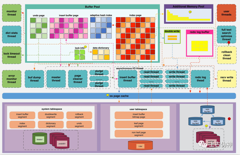 分为线程和内存,Innodb重要的线程有Master Thread,此线程是Innodb的主线程,负责调度其他各线程。