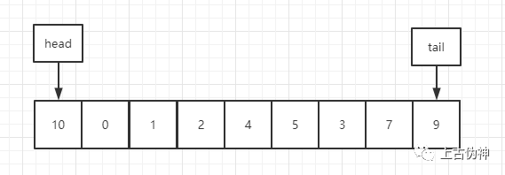 查找元素为10的,但10不在链中,所以将10添加到head,而tail节点6去除
