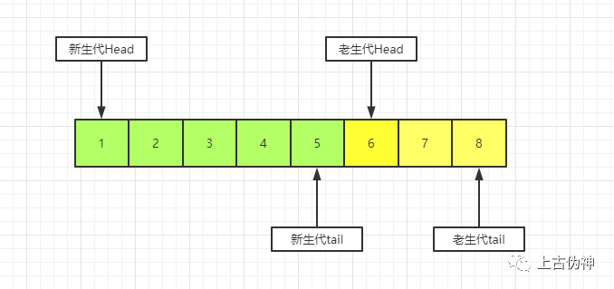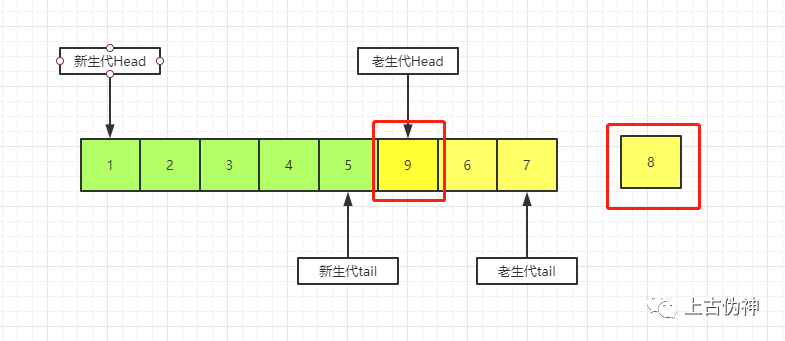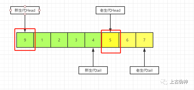 9称为新生代head节点,而原先新生代的tail节点5就变成老年代的head节点