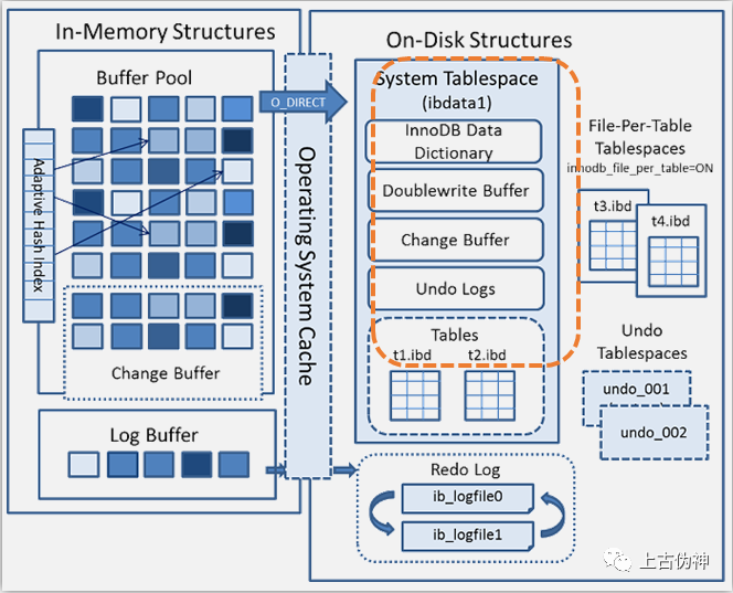 系统表空间里有 ibdata 文件和一些 Undo,ibdata 文件里有 insert buffer 段、double write段、回滚段、索引段、数据字典段和 Undo 信息段。