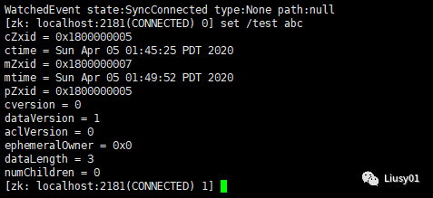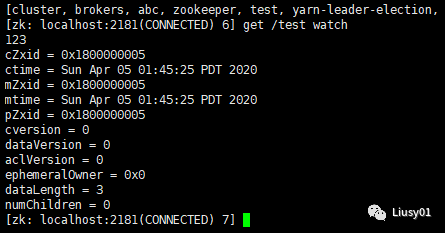 1、节点被创建时的事务idcZxid = 0x18000000052、创建时间ctime = Sun Apr 05 01:45:25 PDT 20203、节点最后一个修改的事务idmZxid = 0x18000000054、最后一次修改时间mtime = Sun Apr 05 01:45:25 PDT 20205、当前节点下的子节点最后一次被修改的事务idpZxid = 0x18000000056、子节点版本号cversion = 07、数据版本号dataVersion = 08、acl版本号,节点权限aclVersion = 09、临时节点所属客户端的sessionidephemeralOwner = 0x010、数据长度dataLength = 311、子节点数量numChildren = 0