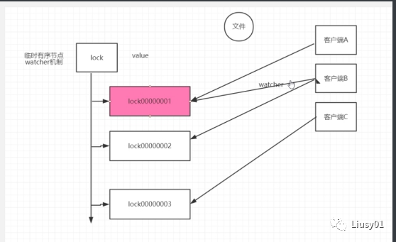 每个客户端都会在某个目录下注册一个临时有序节点,每次最小的节点会获取锁,当前节点会去监听上一个较小节点,如果较小节点失效之后,就会去获取锁。