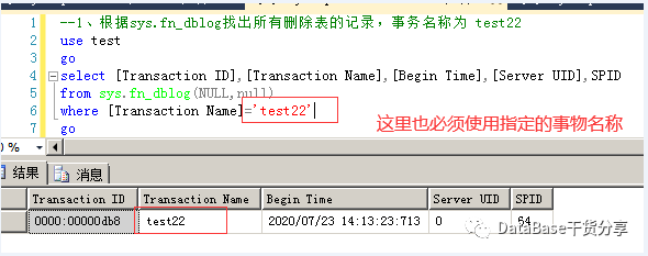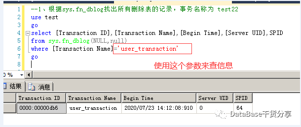 5、如果在删除表时,用户指定了事物名称,在使用sys.fndblog查找结果的时候,[Transaction Name]的值必须使用用户指定的事物名称才能出结果;