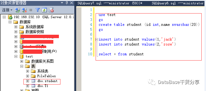 use testgocreate table student (id int,name nvarchar(20))goinsert into student values(1,'jack')insert into student values(2,'rose')select * from student