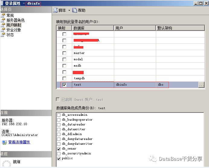 3、创建一个具有test库dba权限的用户dbinfo