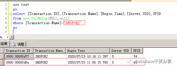 4、通过sys.fn_dblog最后定位到的结果,只能显示object_id,找不到具体的表名,如果有多个用户做了大量的drop操作时,找出的结果也非常多,可能得不到想要的结果;