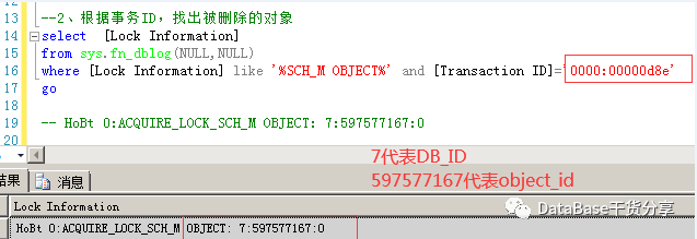 select [Lock Information] from sys.fn_dblog(NULL,NULL)where [Lock Information] like '%SCH_M OBJECT%' and [Transaction ID]='0000:00000d8e'go