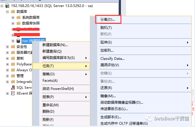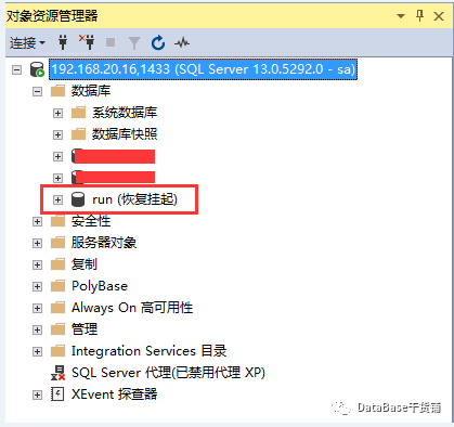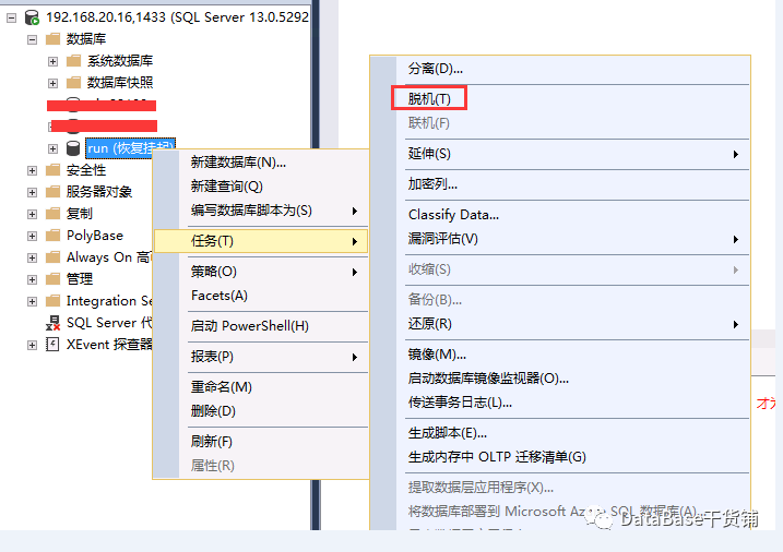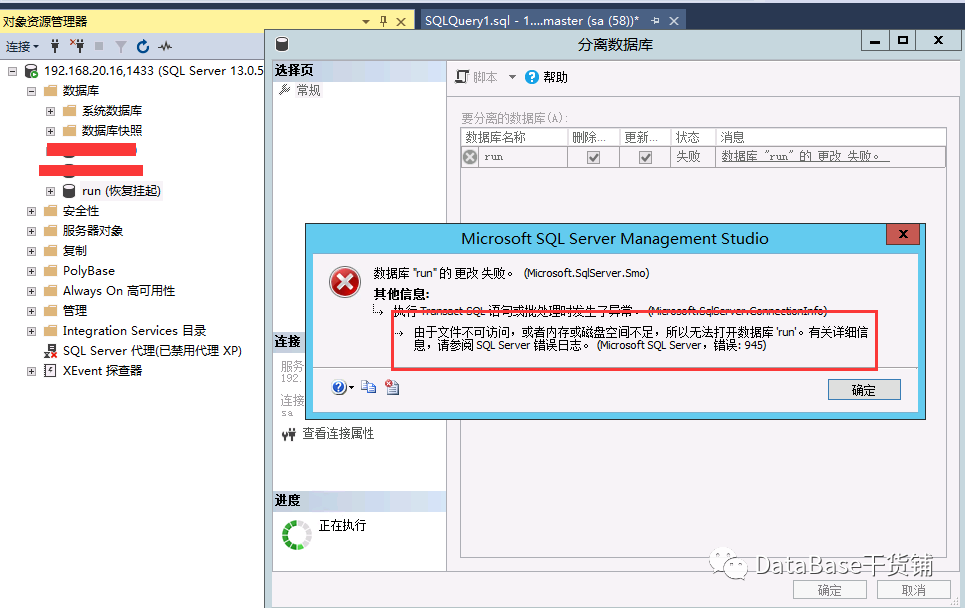 注: 如果能对数据库脱机成功,再次联机也有可能解决,要看数据库是什么原因导致数据库恢复挂起的。