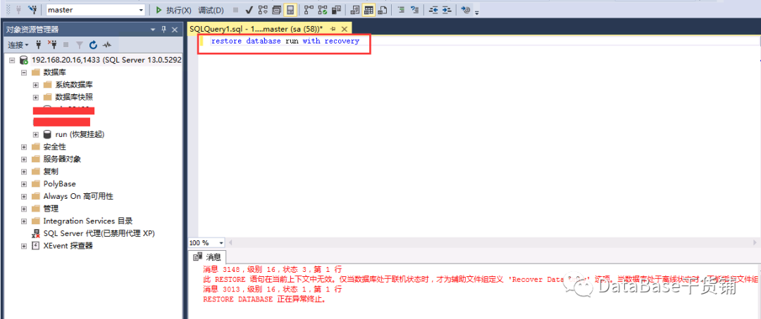 (1)尝试restore数据库失败,提示数据库是离线状态