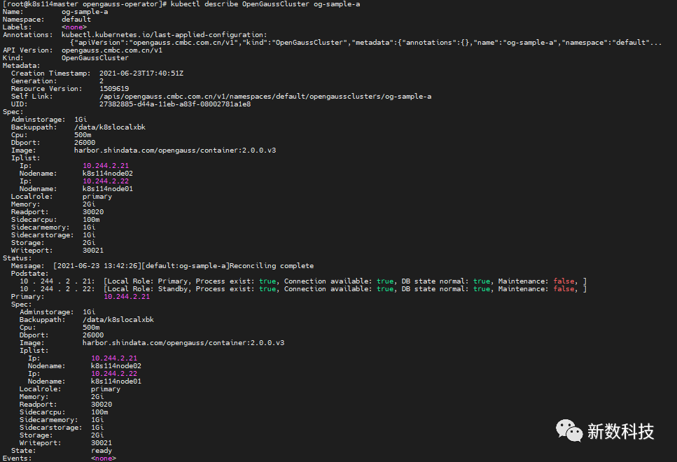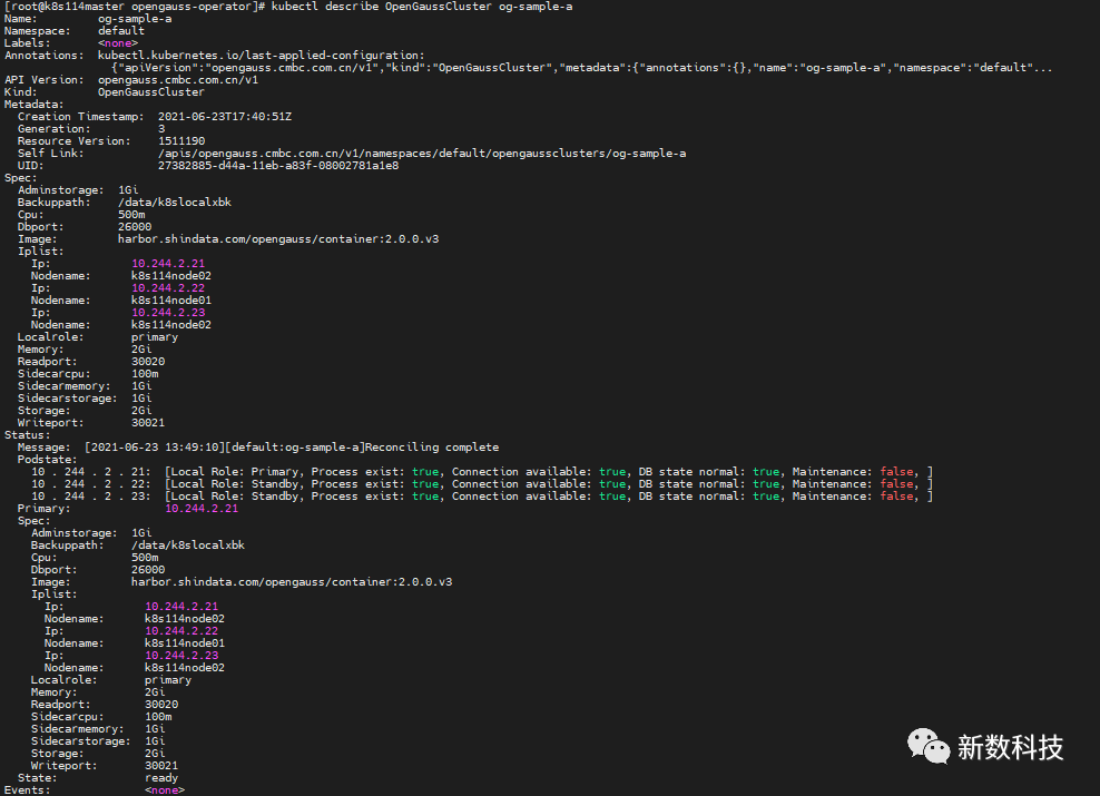 apiVersion: opengauss.cmbc.com.cn/v1kind: OpenGaussClustermetadata:name: og-sample-aspec:image: opengauss.sig/opengauss/container:2.0.0.v1readport: 30020writeport: 30021iplist:- ip: 10.244.2.21nodename: k8snode02- ip: 10.244.2.22nodename: k8snode01- ip: 10.244.2.23nodename: k8snode02