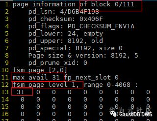2.打开文件,从第一个fsm block开始看。第一个fsm block属于 level root,看到一共111个fsm block,下层的最大空闲空间是31,且在数组0的位置上。