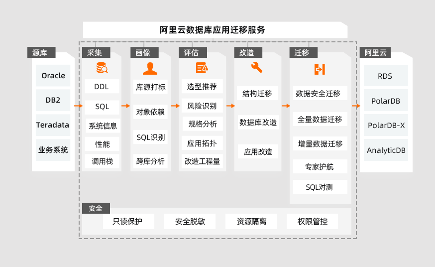 阿里云数据传输产品DTS结合应用和数据库迁移能力,形成一站式异构数据库迁移服务,帮助企业分析整个IT系统架构,实现迁移评估、结构和SQL转换、零停机数据迁移等全流程服务,显著降低迁移技术难度和成本,将不确定变为可评估可把控可执行,加速企业技术升级。