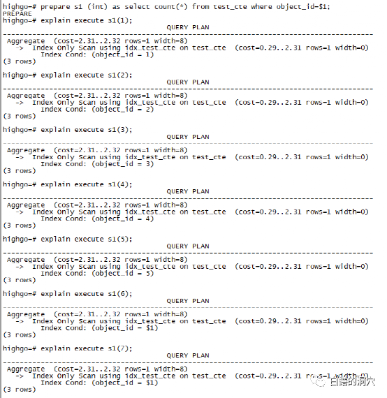 在PostgreSQL的一个会话中,一条SQL的前五次执行,每次都会重新生成执行计划,这样就可以避免因为绑定变量的差异导致存在多种最优执行计划的问题无法被发现的问题出现。如果前五次编译发现存在通用执行计划,那么这个通用执行计划就会被共享。我们来看下面的例子。