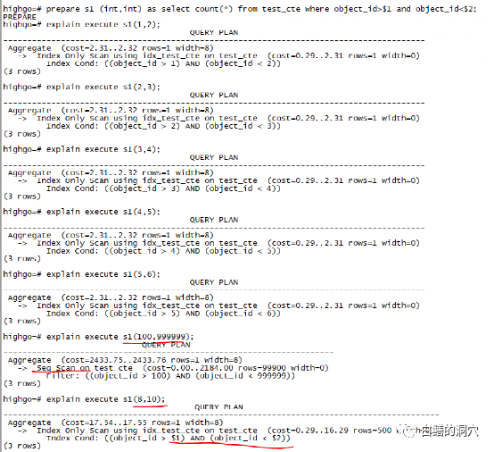 从这个例子上可以看到,如果绑定变量出现了较大的差异,那么PostgreSQL不会一味的用通用执行计划去套用,而是会使用custom执行计划,通过全表扫描来替代索引扫描,从而确保SQL的高效执行,这和Oracle的Adaptive Cursor sharing的思路基本上是一致的。