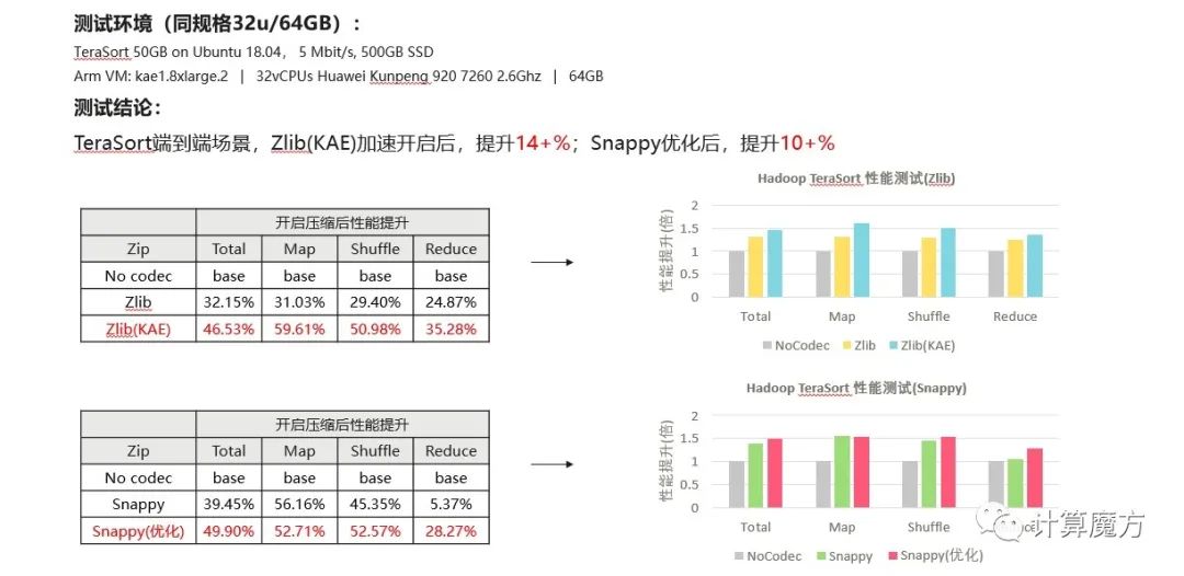 最终,从测试结果看,性能取得了非常明显的提升,并且秉承着“硬件开放,软件开源”的原则,所有优化代码均在贡献到上游社区,全部开源。最终,经过团队的实测,在Hadoop的端到端的性能测试上,也获得了很明显的效果,优化后较优化前整体性能提升10~14%左右: