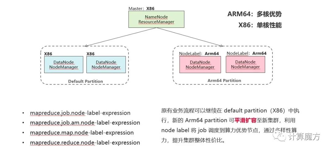 随后,也介绍了Hadoop集群如何在现有集群中进行扩容,可以利用Hadoop社区node label的能力,对新的机器进行标准,按需进行平滑扩容。