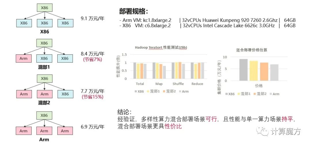 在混合部署的场景中,则为大家举了一个很直观的模拟场景,假设有3个数据节点,若全是单一架构的服务器,成本大概在9.1万元每年左右,随着多样性算力的不断加入,在保证算力性能基本持平的情况下,混合部署的成本能够降低7~15%。