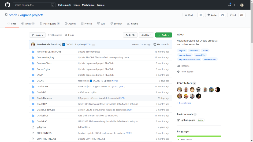第一个是vagrant-projects。可以一键生成Oracle Linux,Oracle单实例,RAC和ADG数据库,还可以选择数据库版本。其它支持的环境包括GoldenGate和Docker。这非常适合在学习过程中搭建开发测试环境,玩坏了也不用担心,一个命令就可以删除重建。
