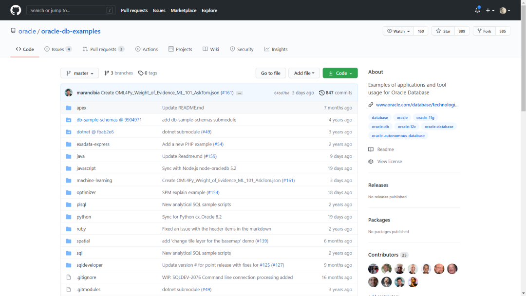 oracle-db-examples是第二个推荐的项目。提供Java,JavaScript,Python,SQL等各类语言与数据库交互的基础示例代码。