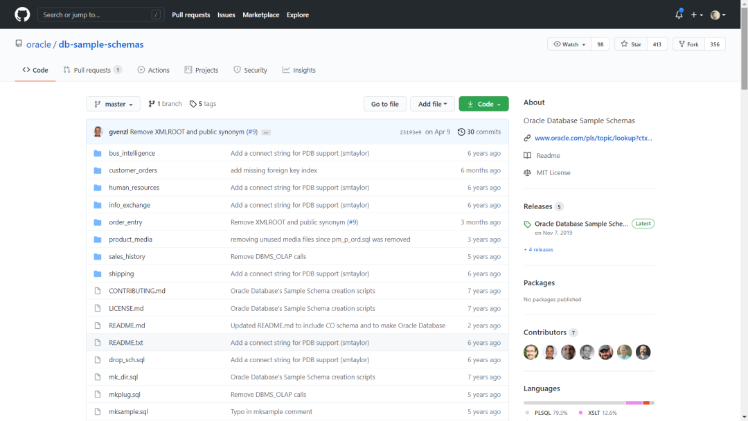 最后一个推荐的是db-sample-schemas。这个是Oracle官方提供的示例Schema,包括人力资源,订单,商务智能等。Oracle文档中很多示例都会使用这些Schema。安装指南可以参看我的这篇博文:如何使用github安装Oracle 数据库Sample Schema(https://xiaoyu.blog.csdn.net/article/details/90605443)。