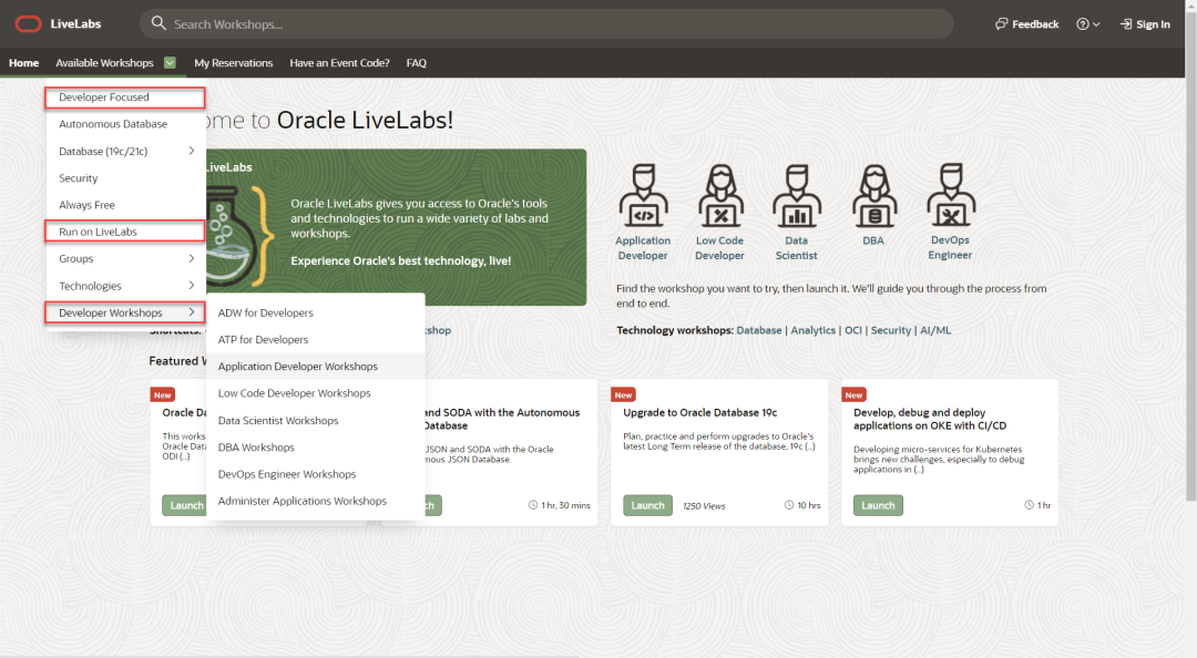 Oracle LiveLabs目前有213个实验。这些实验都是在Oracle公有云OCI上运行的。如果您没有OCI账户,目前有70个实验也支持由LivaLabs自动创建临时实验环境,如图所示,在菜单中选择Run on LiveLabs即可。