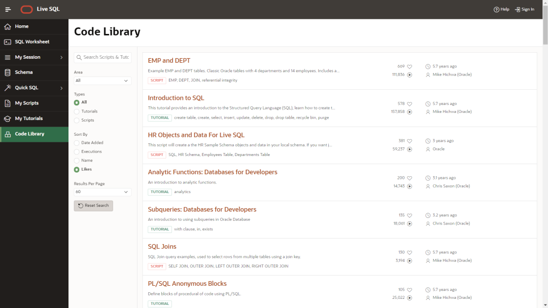 首先来看一下Code Libarary,其中包括Script(脚本)和Tutorial(教程)。Script可以在SQL Worksheet中执行,或下载在你自己的环境中执行。