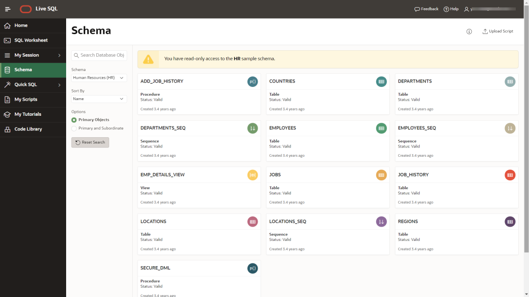 LiveSQL自带示例Schema,如经典的SCOTT,HR和SH等。你可以针对这些Schema进行查询,但不支持运行DML操作。不过你也可以基于示例Schema创建自己的Schema,然后就可以修改了。