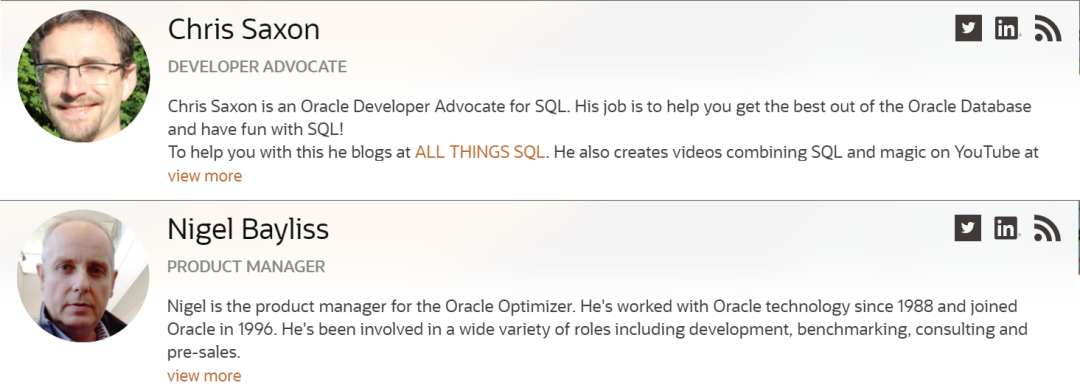 因此,小编推荐SQL和Optimizer两个博客专栏,网址分别是https://blogs.oracle.com/sql/和https://blogs.oracle.com/optimizer。这两个专栏分别由Chris Saxon和Nigel Bayliss主持,这两人都是资深Oracle人,一个是SQL倡导者,一个是SQL产品经理,文章都非常权威和耐看。Chris Saxon我们最后还会介绍。