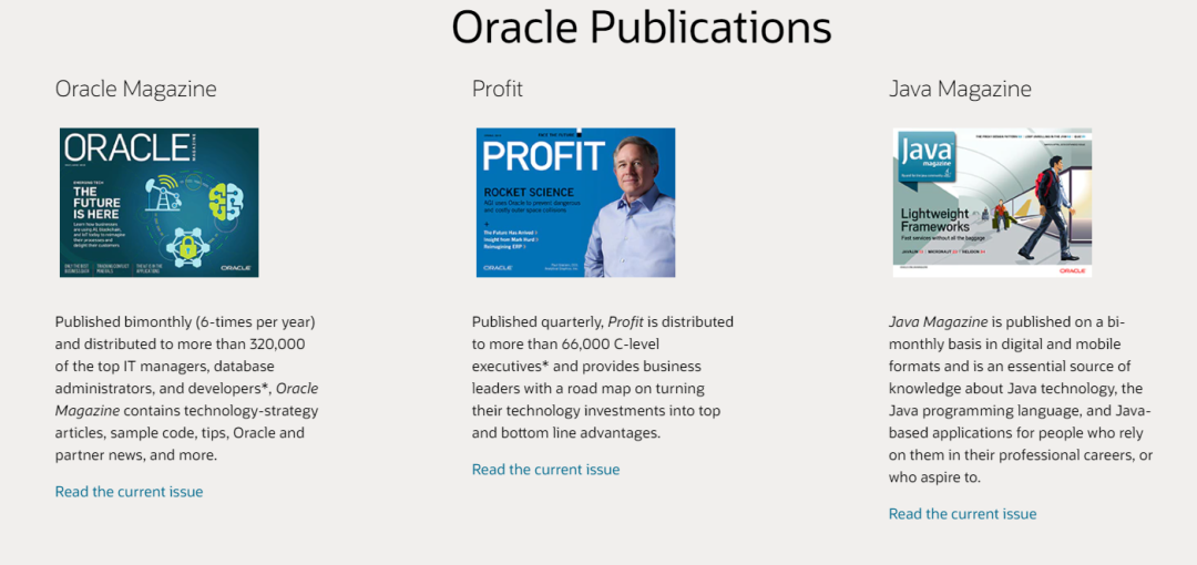 各位稍安勿躁,听我慢慢道来。Oracle原来有三本电子期刊,分别是Oracle Magazine,Oracle Profit和Java Magazine。
