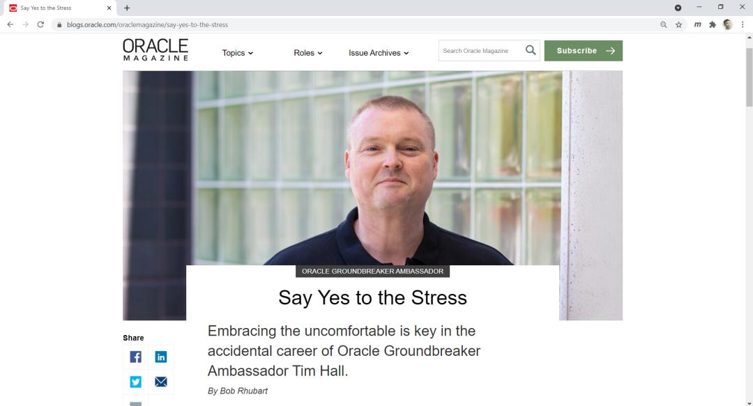 在这一节的最后,推荐大家看一篇Oracle Magazine中的文章。这篇文章的主角是Tim Hall,在文章开篇也提到过。他被授予Oracle开创大使的称号,不仅如此,他还拥有生物学学位,是基因工程博士,空手道黑带,同时是一名认证瑜伽教练。最重要的,他和接下来要介绍的资源有关。