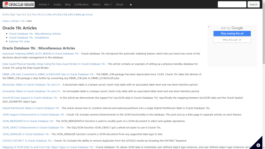 是的,ORACLE-BASE网站的作者正是前面介绍过的Tim Hall。ORACLE-BASE网站并非来自Oracle官方,Tim Hall也不是Oracle员工,但此网站在Oracle学习圈可谓大名鼎鼎。从数据库安装配置到各自Oracle特性,从Oracle 8i到21c,超过1000篇文章,可谓全面细致。具体内容就不多说了,您一定可以找到所需要的内容。