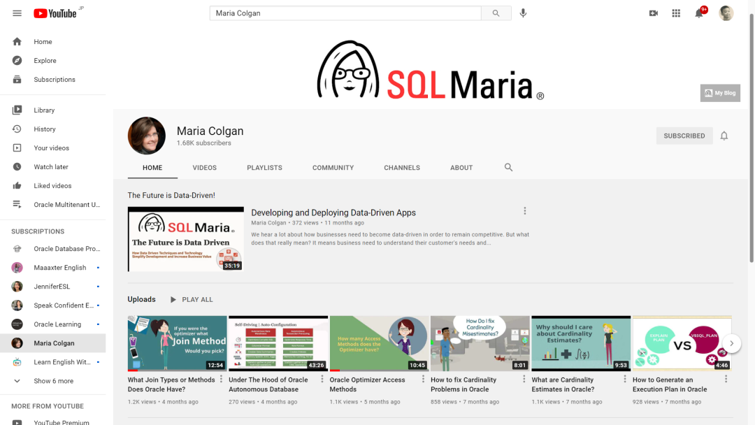 个人频道方面,首先推荐的是Maria Colgan,一个可爱的老太太。Maria Colgan江湖人送外号SQL玛丽亚,之前是数据库查询优化器和Database In-Memory的产品经理,现在主要的任务是创建有关 Oracle 数据库的材料和讲座,以及将其整合到用户环境中的最佳实践。视频推荐看那些带动画的,都是精心制作,同时也非常有趣。