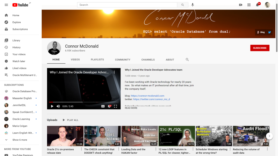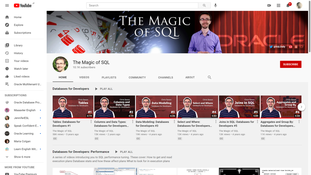 Oracle在Youtube上有非常丰富的视频教学资源。公司开办的频道建议订阅Oracle Database Product Management和Oracle Developer。