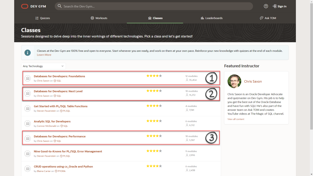 这里要重点推介一下其中的开发者系列课程。都是由Chris Saxon主讲的,每个系列10节课左右。学习的顺序如下图所示,依次为开发者初级课,开发者进阶课和开发者性能课。
