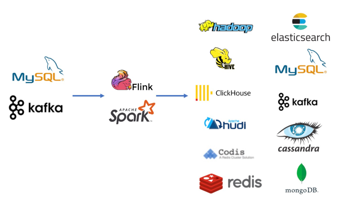 当前公司的大数据实时链路如下图,数据源是MySQL数据库,然后通过Binlog Query的方式消费或者直接客户端采集到Kafka,最终通过基于Spark/Flink实现的批流一体计算引擎处理,最后输出到下游对应的存储。